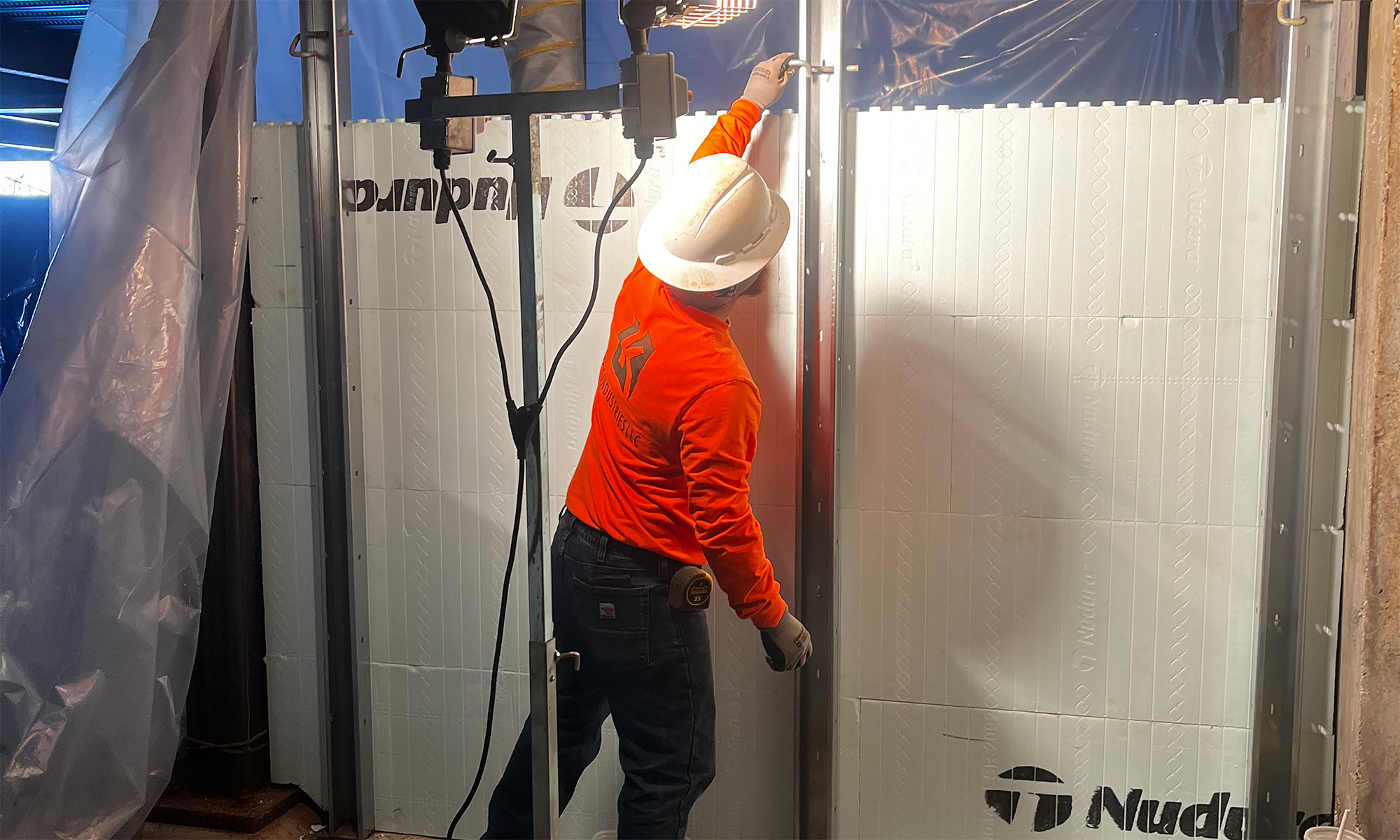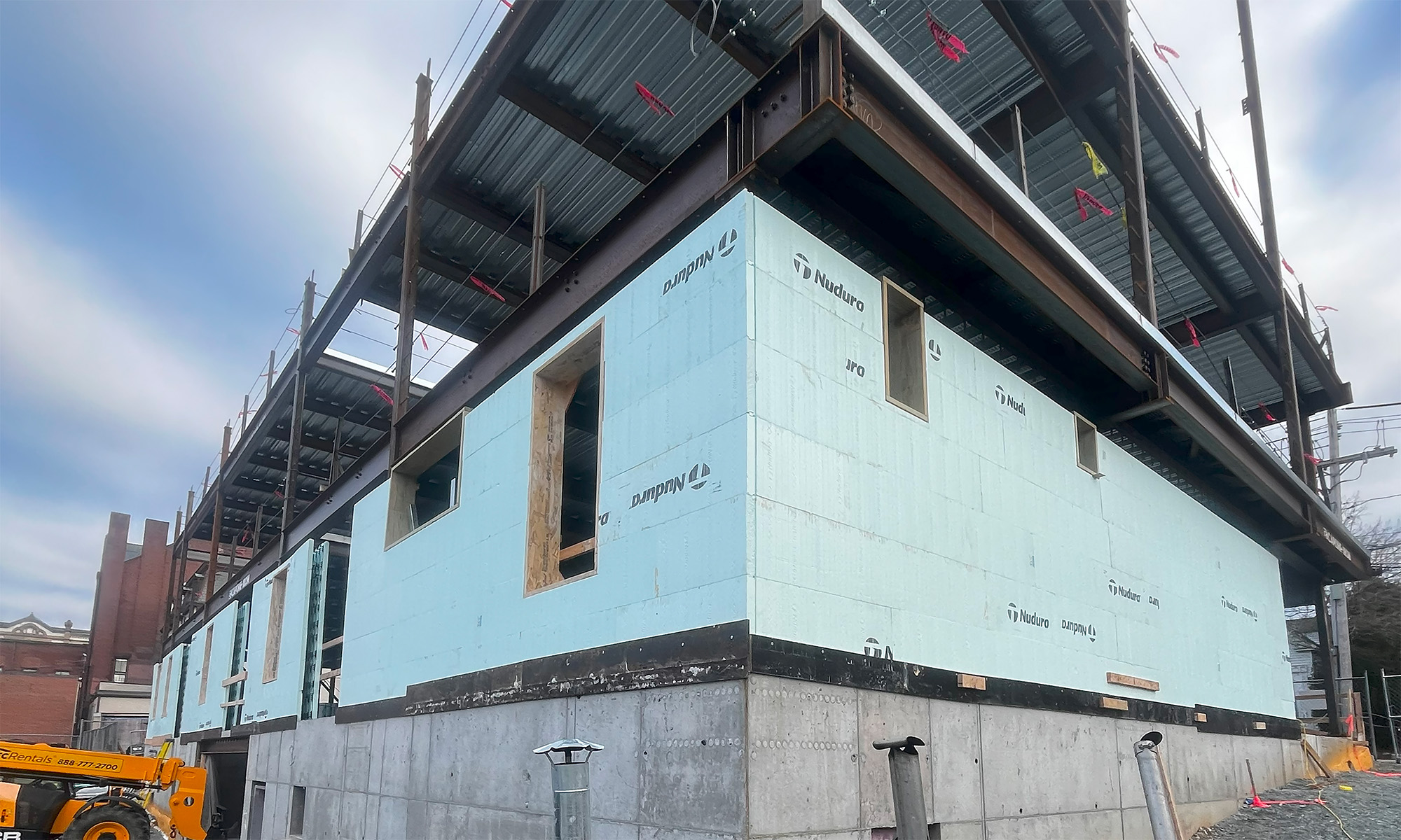 The structure itself was originally designed as light-gauge metal framing, but the contractor convinced the owners to go with Nudura Insulated Concrete Forms for their energy efficiency, sound attenuation and durability. At this point, however, the steel structure had already been erected, so ICF walls had to be stacked around the existing steel columns. This situation also meant there was only 2” of space to pour the concrete, which necessitated the use of external suction vibrators, compared to conventional internal vibration.