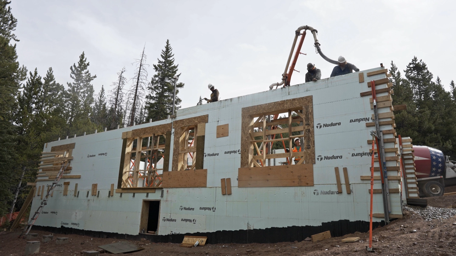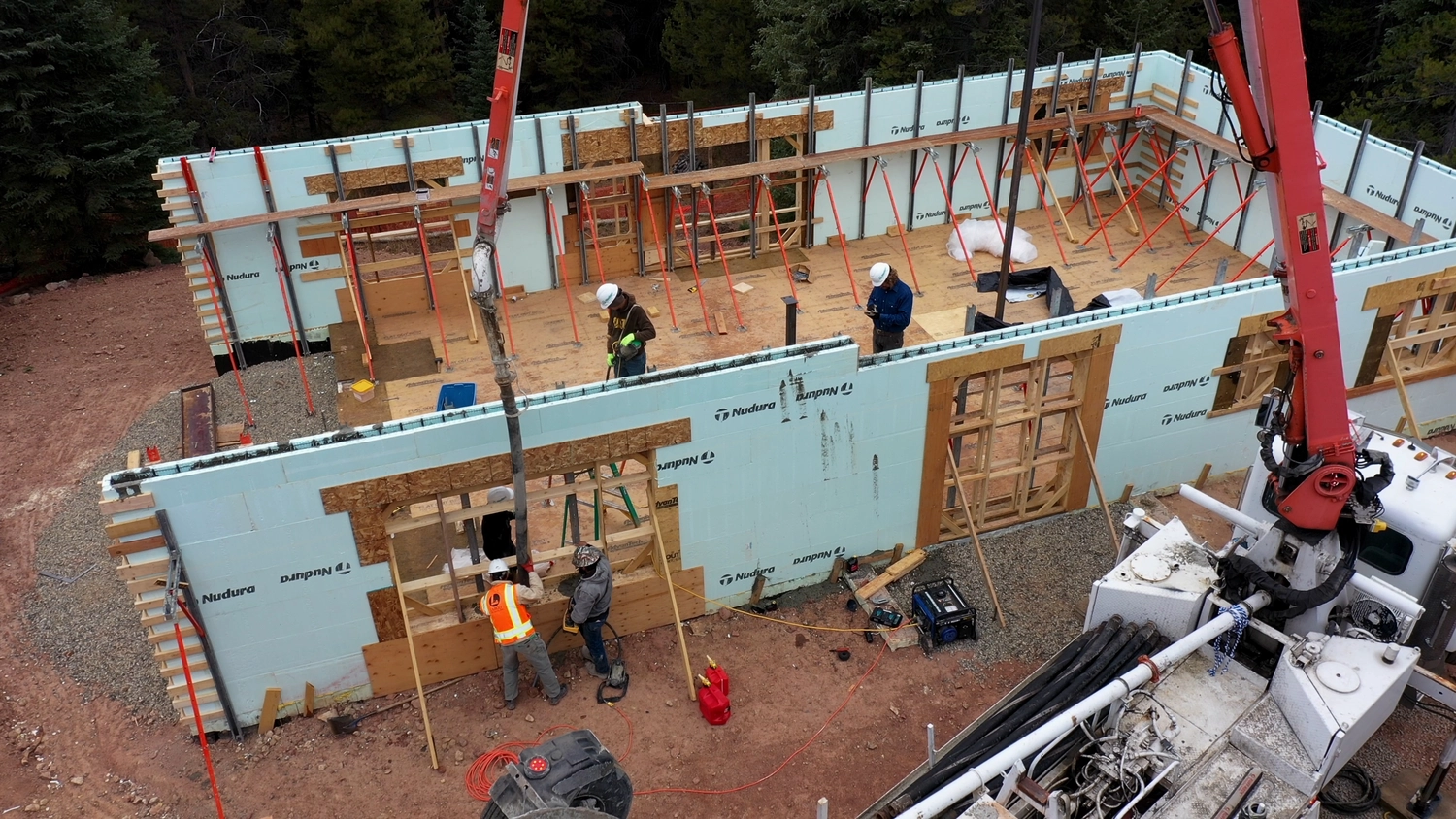 The homeowner, Kreg Obergfell, who also served as the architect, selected Nudura Insulated Concrete Forms for the foundation and 75% of the exterior walls. This decision was based on ICFs’ superior thermal performance, structural integrity and fire resistance, given the potential for wildfires with the surrounding trees. The strength of the ICF walls also accommodated the extensive windows to maximize natural light and visibility to the outdoors.