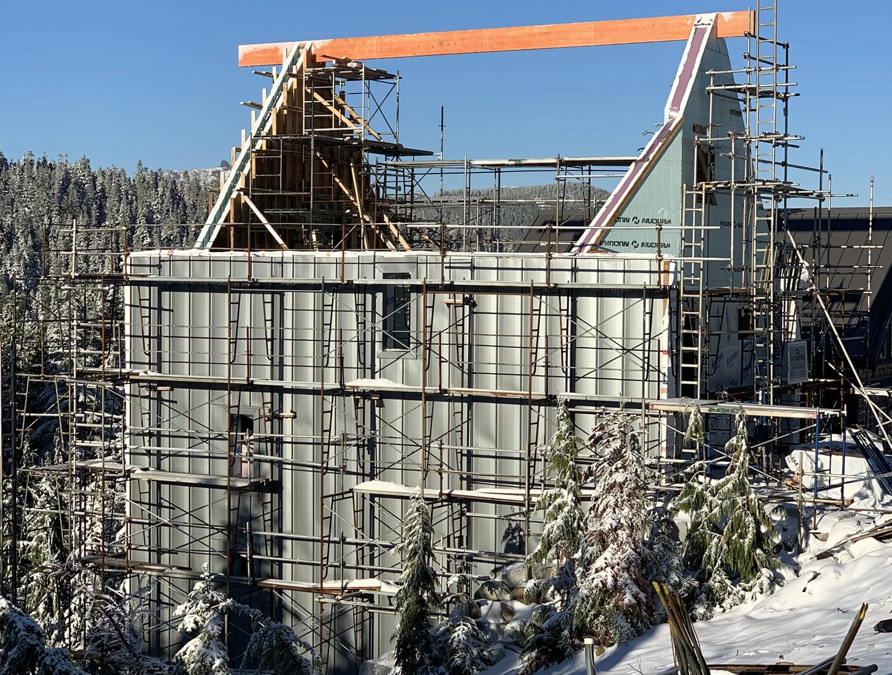 Building the Mount Washington Chalet required extra design and construction considerations to accommodate the steep 30-degree slope, rocky terrain, potential seismic activity and the owners’ sustainability goals. The successful execution of this ambitious project was made possible in large part due to Nudura’s XR35 Insulated Concrete Forms (ICFs).